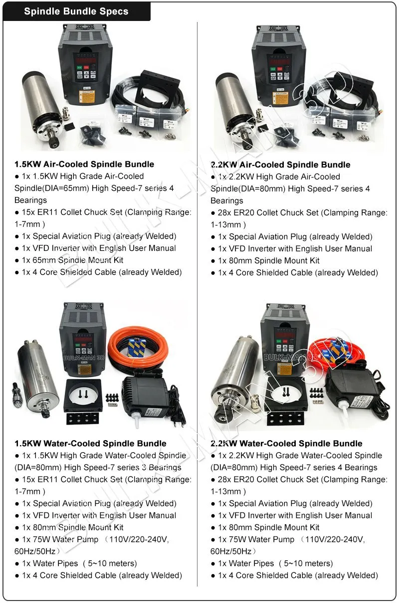 The 1.5kW Air, 1.5kW Water, 2.2KW Air or 2.2kW Water Cooled Spindle Bundle contains all the hardware for mounting a the Spindle on your QueenBee PRO or other CNC machine.