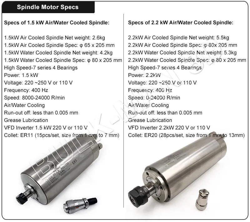 The 1.5kW Air, 1.5kW Water, 2.2KW Air or 2.2kW Water Cooled Spindle Bundle contains all the hardware for mounting a the Spindle on your Queenbee PRO or other CNC machine.