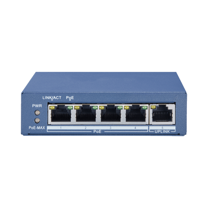 - 4 x Gigabit PoE ports, and 1 x Gigabit RJ45 port