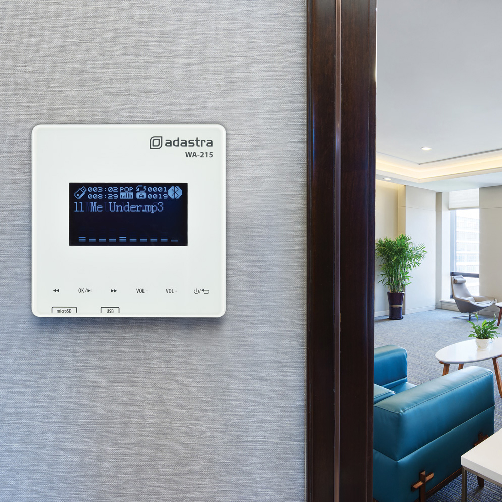 Compact audio amplifier with 2 x 15W digital amplifier built into a single gang wall plate. Powered directly from 100-240Vac mains supply, the unit can be installed into a partition wall or 47mm back box and provides a minimal yet fully functional control surface. The WA-215 has an integral USB/MicroSD audio player, an FM tuner and Bluetooth receiver. Key functions are operated from the front touch panel or by using the supplied IR remote control. Connections for 2 x 8 ohm speakers, mains power, FM antenna and an external line input are provided at the rear on screw terminal Euroblock connectors. Trigger contacts are also included for media playback and in internal doorbell sound. A complete and versatile audio solution for wall or ceiling background music speakers in the home or commercial premises