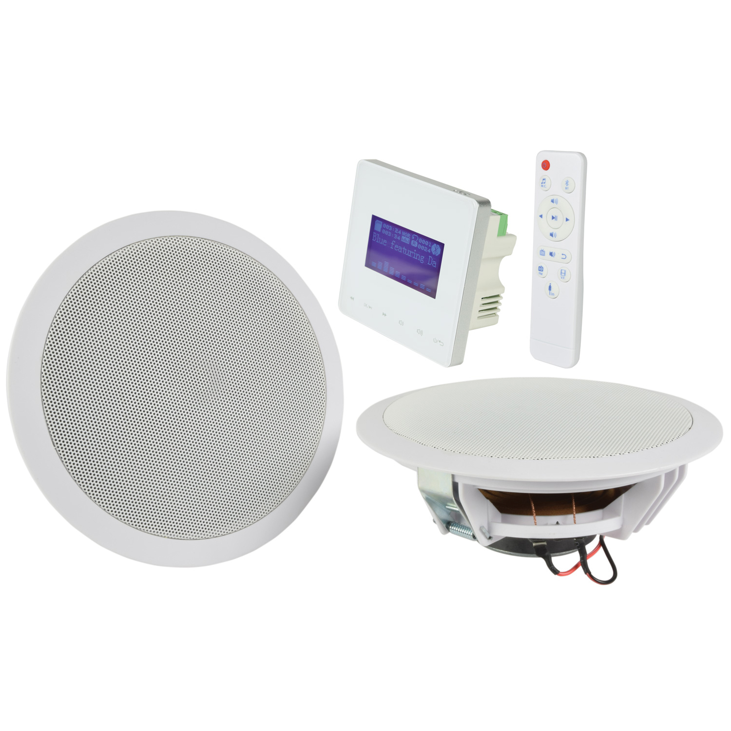 WA-215 wall amplifier with inbuilt media player and Bluetooth® receiver, a pair of white ceiling speakers and 10m speaker cable. Provides a full background music system for discreet installation in the home or commercial premises such as doctor reception, staff room and MOT viewing areas.