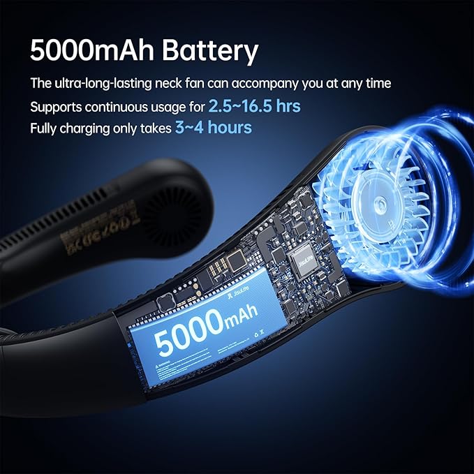- 2.5-16.5 Running Hrs & USB Charging: This rechargeable neck fan, equipped with a high-capacity 5000mAh battery, delivers 2.5 – 16.5 hours of runtime, depending on the speed setting. The neck cooler fan takes 3 – 4 hours to fully charge via USB Type-C, and you can use it while charging