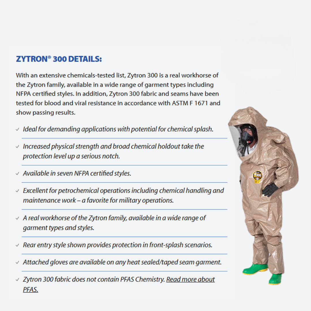 The Kappler Zytron 300 is a line of chemical protective clothing made by Kappler, designed for hazardous material (HazMat) response and chemical handling situations. It offers a high level of protection against a wide range of chemical hazards, including industrial chemicals, chemical warfare agents, and toxic industrial materials.