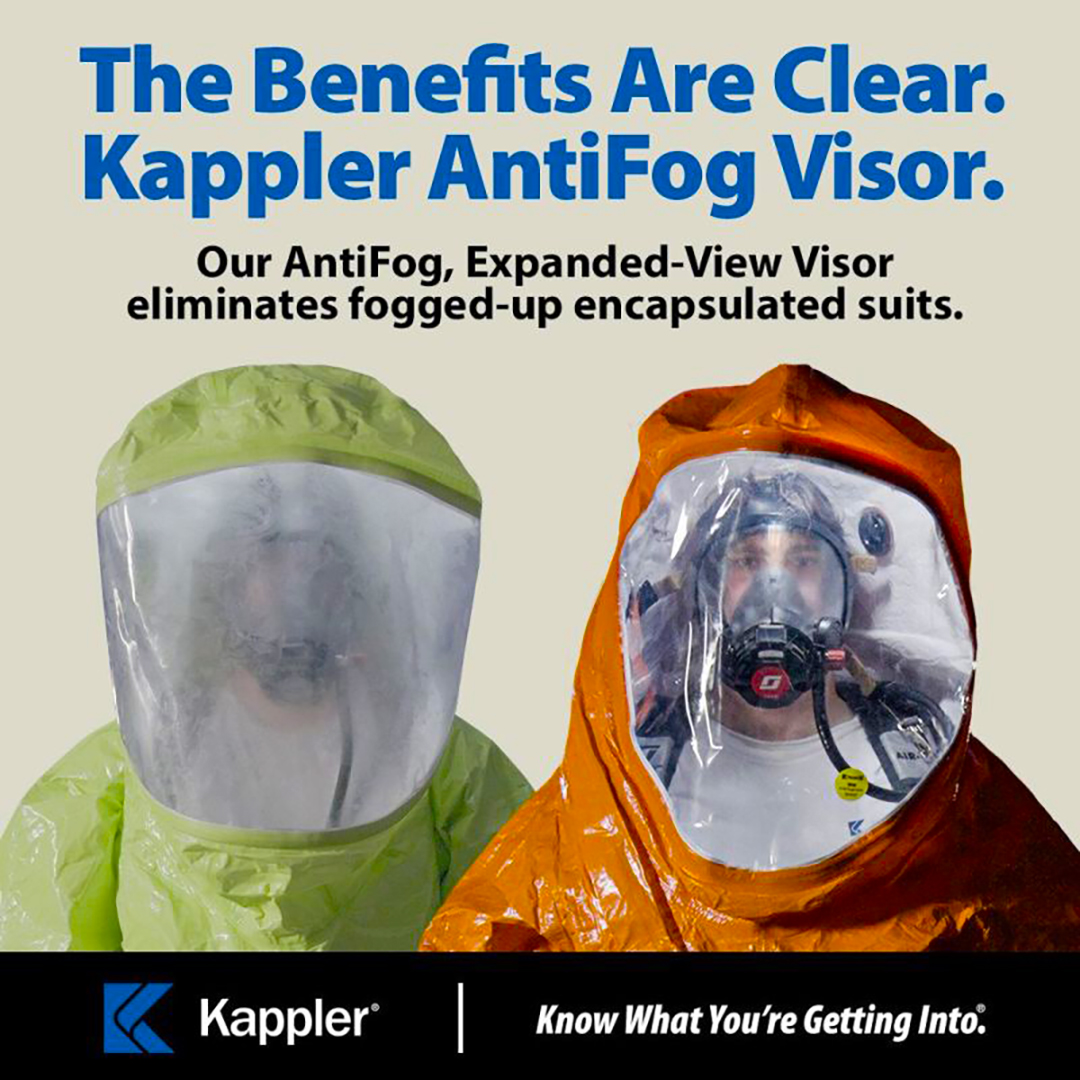 Kappler’s AntiFog Expanded-View Visor is standard on all gas-tight suits including NFPA-certified styles.