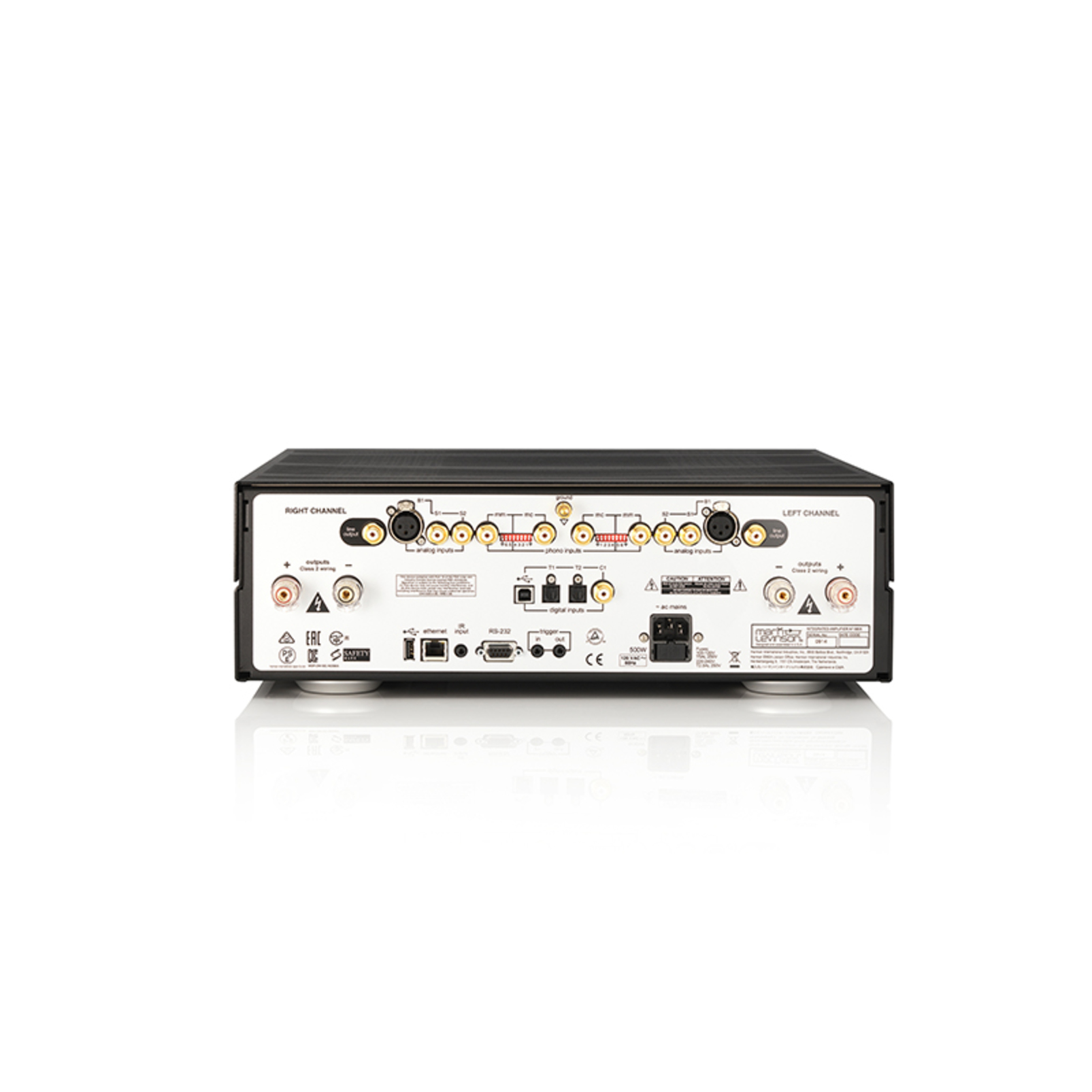 : <0.0025%, 20Hz to 20kHz, at 3V RMS output (192kHz/24 bit signal); <0.003%, 20Hz to 20kHz, at 3V RMS output (44.1kHz/16 bit signal); <0.006%, 90kHz, at 3V RMS output (192kHz/24 bit signal) Signal-To-Noise Ratio Sample Rates/Bit Depth Digital Processing HEADPHONE OUTPUT Total Harmonic Distortion Output Overload Signal-To-Noise Ratio Output Impedance AMPLIFIER SECTION Frequency Response Signal-To-Noise Ratio Total Harmonic Distortion + Noise Output Power Output Impedance Damping Factor GENERAL Analog Input Connectors (No5805 Only): • 1 pair balanced line-level inputs (XLR) • 2 pairs single-ended line-level inputs (RCA) • 1 pair single-ended moving-coil phono inputs (RCA) • 1 pair single-ended moving-magnet phono inputs (RCA) Digital Audio Connectors: • 2 optical digital inputs (Toslink) • 1 asynchronous USB digital input (USB-B) • No5805: 1 coaxial digital S/PDIF input (RCA) • No5802: 2 coaxial digital S/PDIF input (RCA) • No5802: 1 balanced digital AES/EBU input (XLR) Output Connectors: • 1 pair single-ended line-level outputs (RCA) • 2 pairs loudspeaker outputs (High-current binding posts with banana sockets; accept spade lugs with 1⁄4”/6.3mm spacing up to 1⁄8”/3mm thick) Control Connectors: • 1 RS-232 port (DB9 connector) • 1 IR input (1⁄8”/3.5mm phone jack) • 1 programmable 12V DC trigger output (1⁄8”/3.5mm phone jack), 100mA maximum • 1 programmable 12V DC trigger input (1⁄8”/3.5mm phone jack) • 1 Ethernet port (RJ-45 connector) : >100dB (20Hz to 20kHz, 192kHz/24 bit signal, A-weighted);