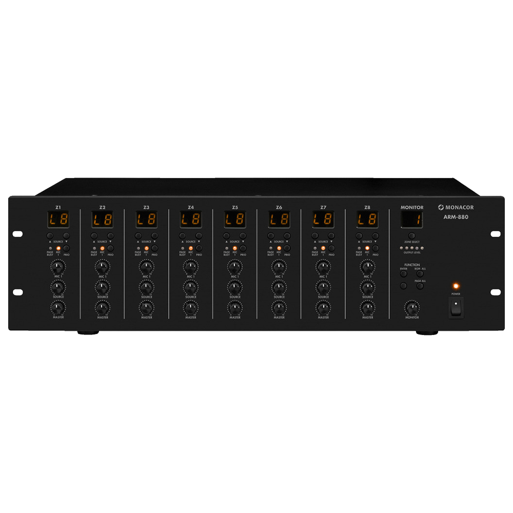 The Monacor ARM-880 system is a highly flexible PA solution for multi-room applications. It is ideally suited for applications in hotels, in restaurants and bars, in conference rooms, schools, sports facilities and fitness centres. Eight different audio sources, e.g. CD players, SAT receivers, radio programmes can be distributed to 8 output zones, assignment as required.