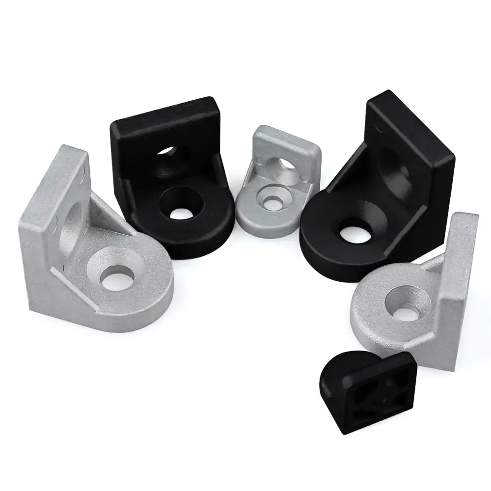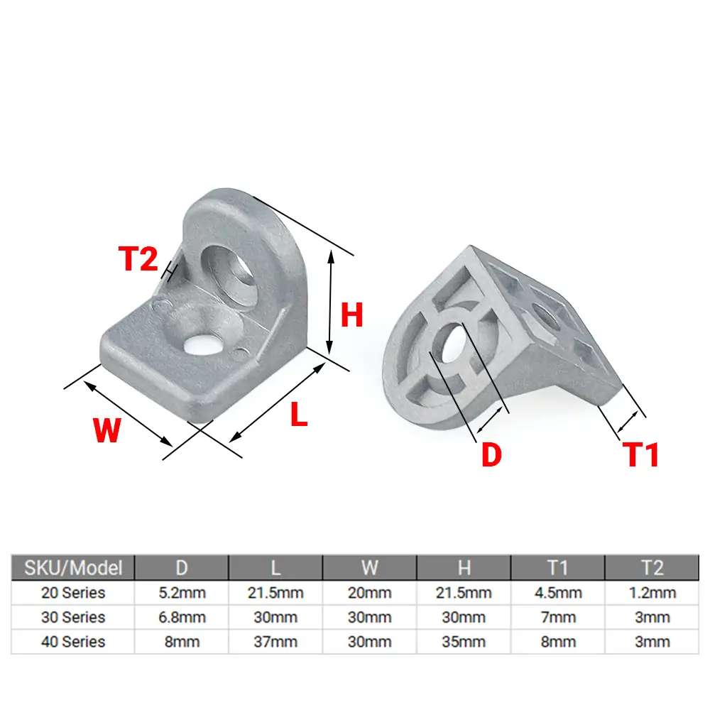 These are standard Steering Angle Corner L Brackets used to connect 2020/3030/4040 series V-Slot or T-Slot aluminum extrusions together for a 90-degree connection. These corner brackets are made of high-quality aluminum alloy, which is strong and durable.