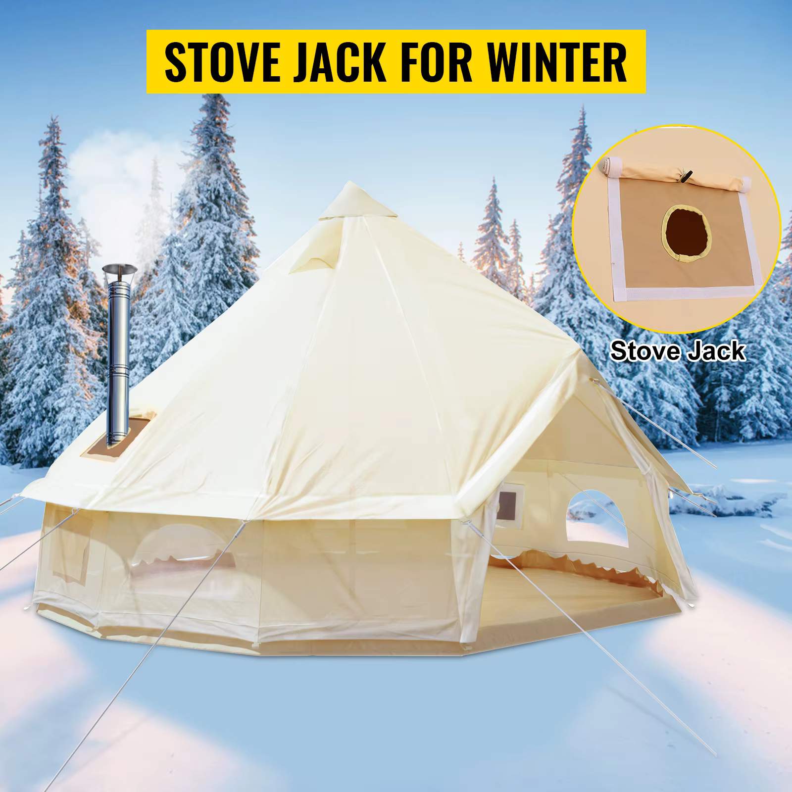 - This 4-season waterproof Vevor Canvas Bell Tent is made of a 300gsm cotton canvas, which is lightweight and durable. The Vevor Canvas Bell Tent is large enough for 5-8 people to sleep and strong and durable enough to withstand stormy weather. A stove jack is designed for winter, and complete accessories are included for easy setup. Thus, our bell tent is perfect for glamping, camping, hiking, backpacking, trekking, mountaineering, etc.
