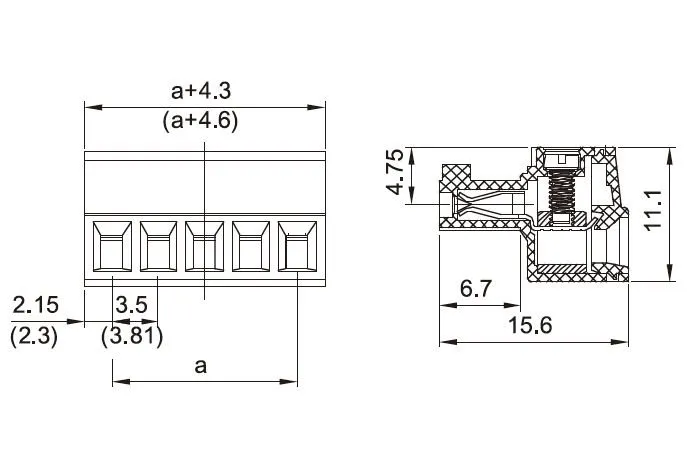 - Distance between contacts (centre): 3.81mm/5.08mm