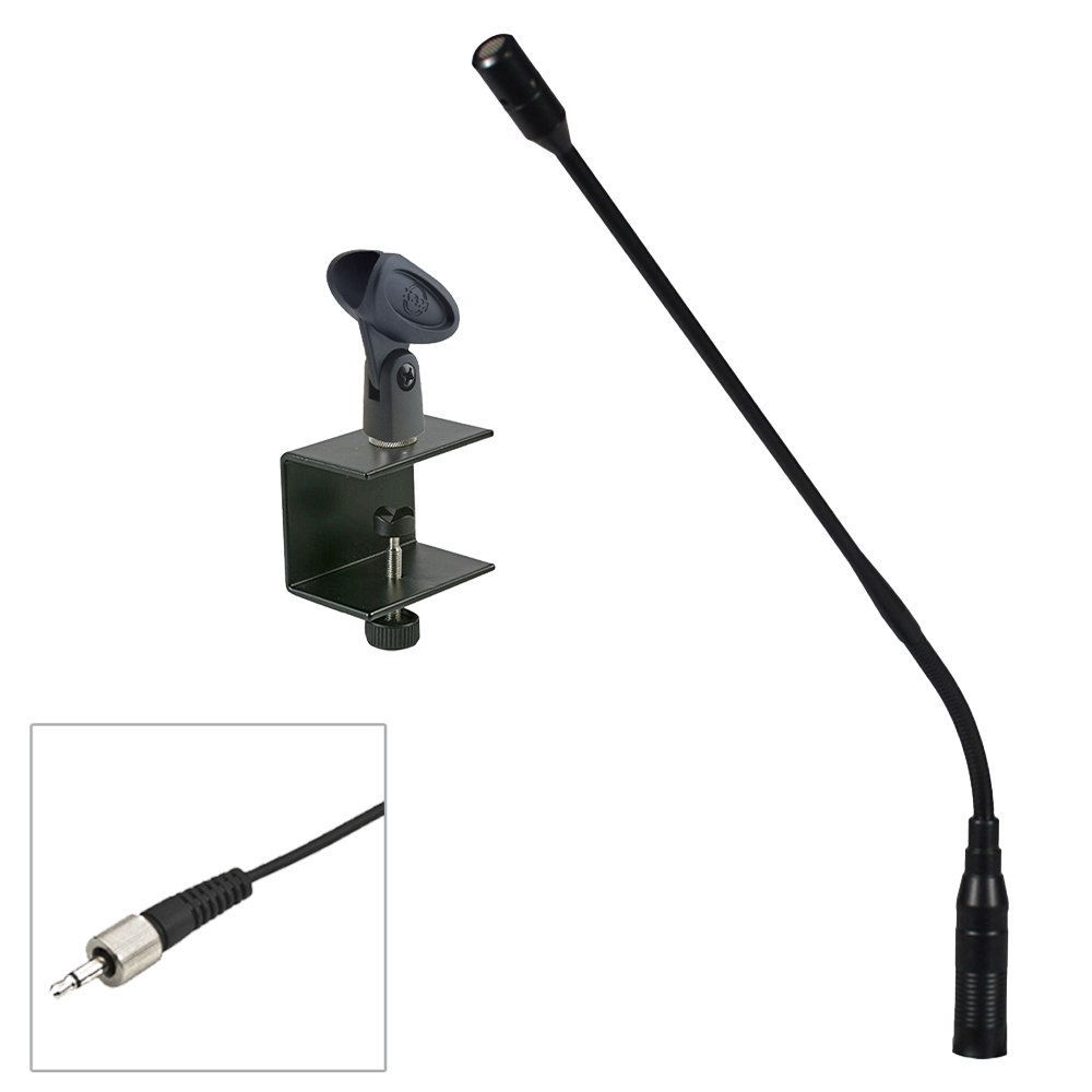 - Kit includes gooseneck lectern mic, lectern or table ‘G’ clamp, mic swivel clamp and connector cable for wireless microphone transmitter