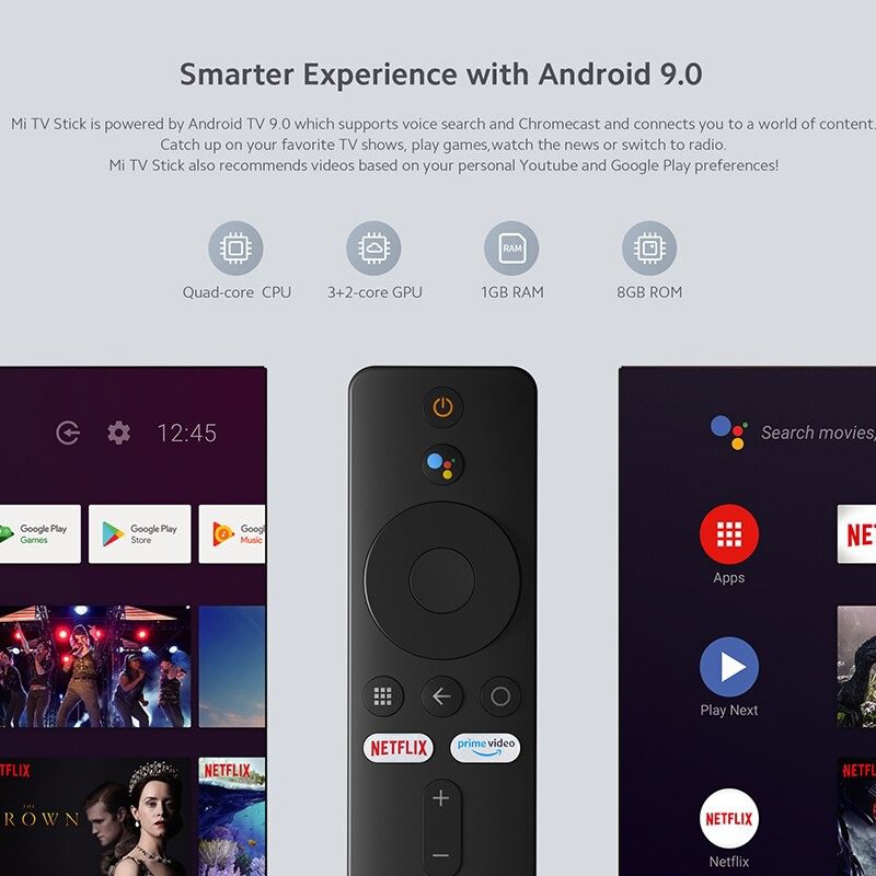 Mi TV Stick is powered by Android TV 9.0 which supports voice search and Chromecast and connects you to a world of content. Catch up on your favorite TV shows, play games, watch the news, or switch to radio. My TV Stick also recommends videos based on your personal preferences from Youtube and Google Play.